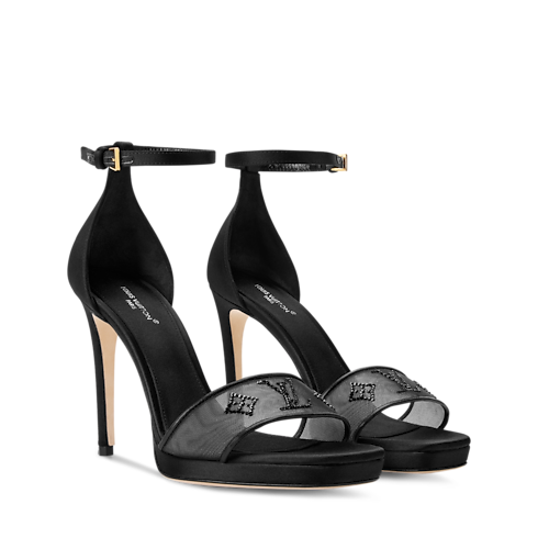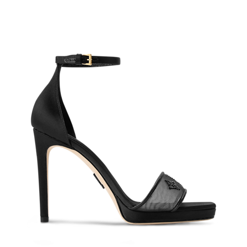 Il sandalo con plateau Gala è un modello sofisticato, con la fascetta anteriore in tessuto a rete trasparente impreziosita da scintillanti strass Swarovski™ che ricreano il motivo Monogram di Louis Vuitton. Il sottile cinturino alla caviglia, regolabile mediante una piccola fibbia, esalta ulteriormente l'eleganza della calzatura, completata dal tacco a spillo.