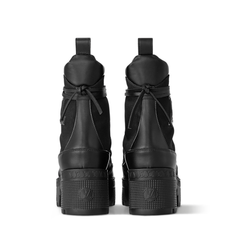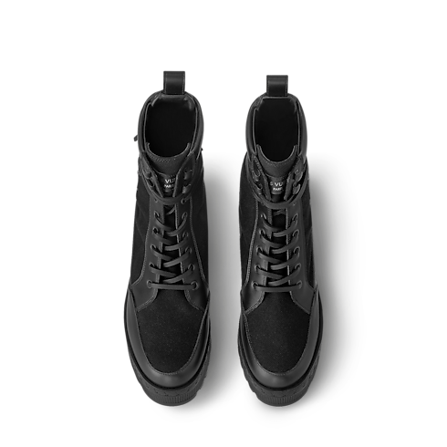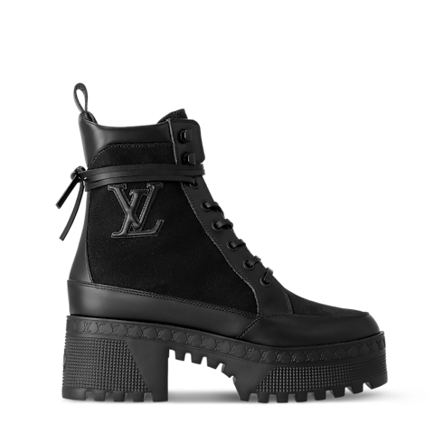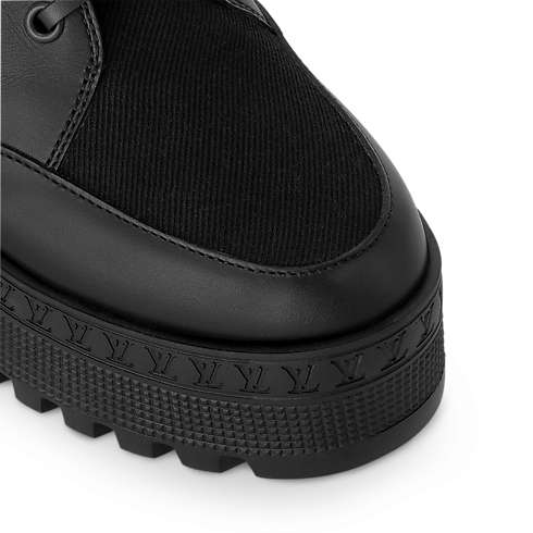 Lo scarponcino con plateau Laureate è riproposto in una versione in tela, con finiture e lacci in pelle di vitello. L'iconica calzatura della Maison è completata dalla leggera suola decorata dal motivo con firme LV, che rievoca le losine degli storici bauli di Louis Vuitton. Il modello è impreziosito dalle emblematiche iniziali oversize sul lato.