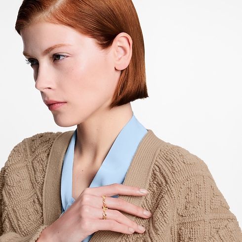 Il set di anelli LV Script si caratterizza per il design essenziale ma distintivo, ispirato alla nuova firma Louis Vuitton presentata alla sfilata Primavera-Estate 2025. I due accessori, realizzati in lucente metallo dorato, compongono il nome della Maison in un'elegante versione in corsivo. Le raffinate creazioni donano un tocco accattivante e originale a qualsiasi look.
