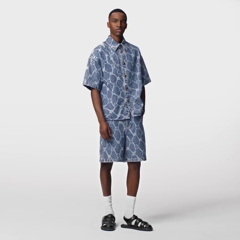 Gli shorts casual in denim lavato, ispirati al tema nautico della collezione, sono perfetti per le giornate estive in spiaggia. Il modello è contraddistinto dal motivo Monogram Fishnet sbiancato, abbellito dai dettagli degli iconici fiori. La fantasia irregolare, simile a riflessi sull'acqua, dona un originale effetto grafico al capo, da abbinare alla camicia a maniche corte per un look contemporaneo.