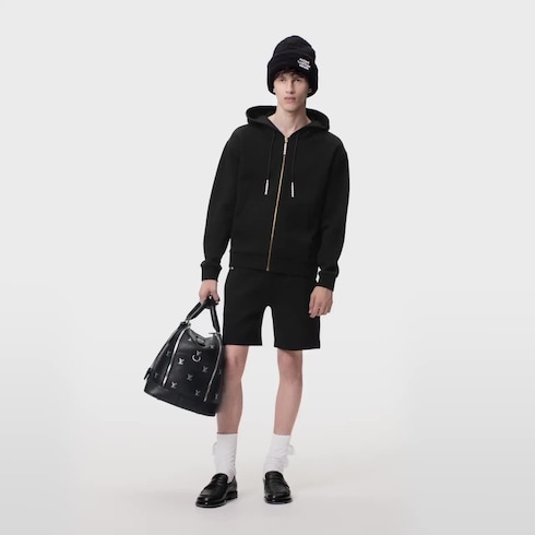 Gli shorts, realizzati in jersey di cotone color nero, si distinguono per le eleganti perline che decorano i tiretti delle tasche. La gamba sinistra è impreziosita da un delicato ricamo con la nuova firma "Marque L. Vuitton Déposée", presentata durante la sfilata Primavera-Estate 2024. Il capo può essere abbinato alla felpa con cappuccio coordinata per un look casual-chic.