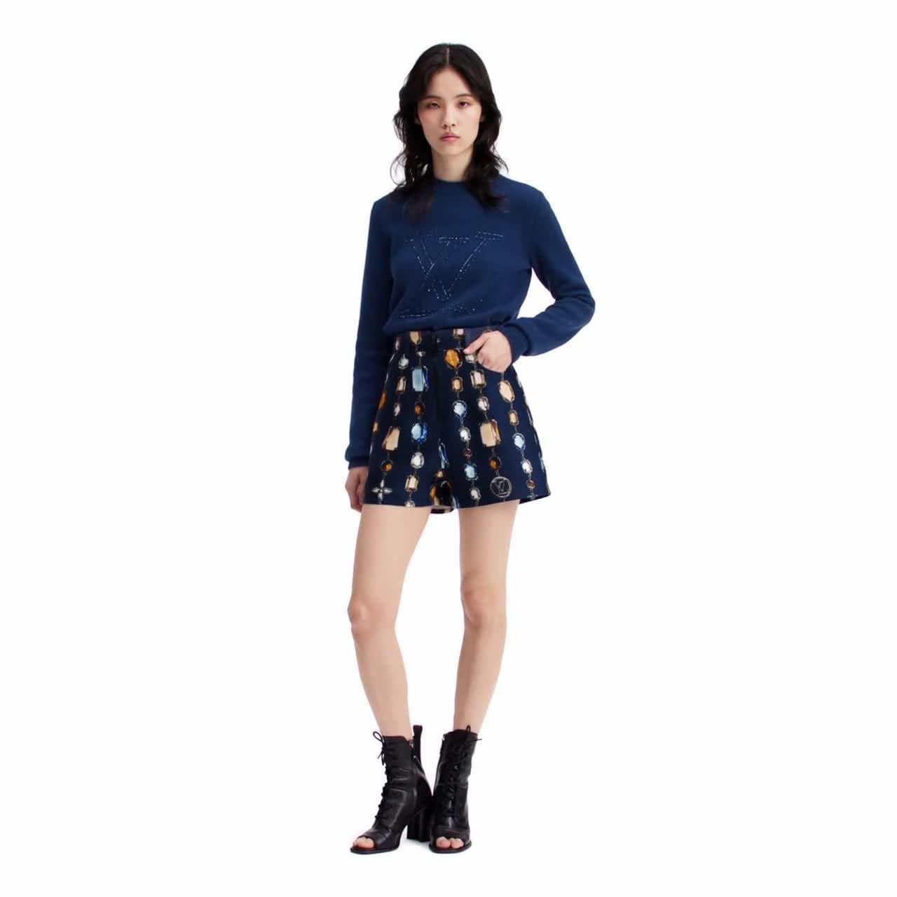 Gli shorts, proposti in elegante mikado di misto lana e seta, sono impreziositi da un'accattivante motivo di collana stampato all-over. L'esclusiva creazione combina la rappresentazione degli eleganti pendenti con firma Louis Vuitton a quella di una gamma di colorate gemme preziose. Il raffinato taglio sartoriale e la zip oversize completano il modello con un'ulteriore nota contemporanea.
