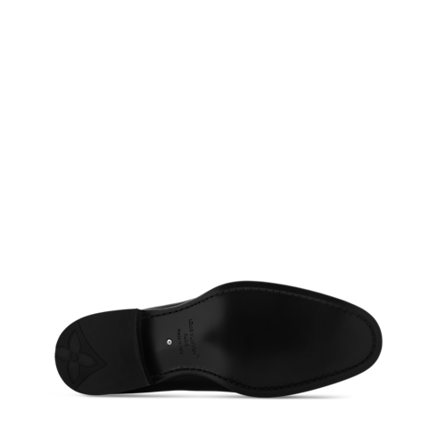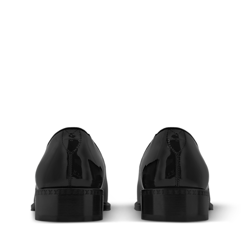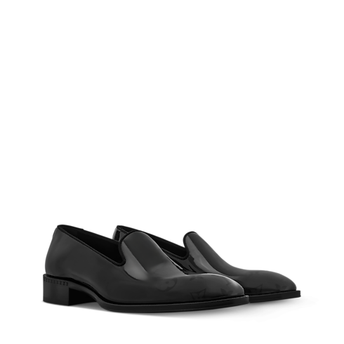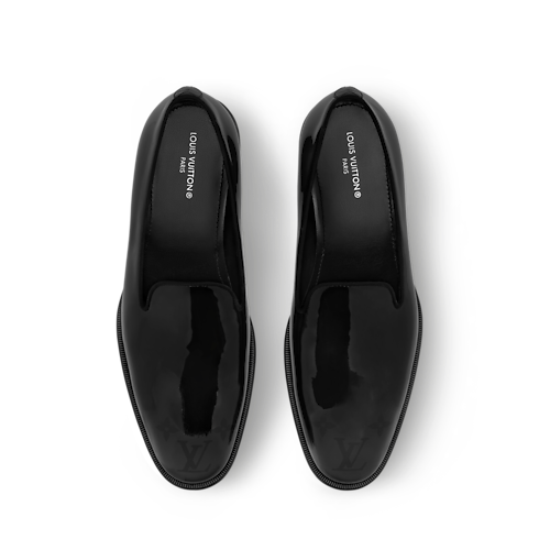 La slipper LV Premiere è realizzata in lucida pelle di vitello verniciata, che ne esalta le linee sofisticate ed eleganti. Il modello, caratterizzato dal tacco leggermente più alto rispetto al design classico, reinterpreta la silhouette raffinata dei gentiluomini inglesi. La punta è impreziosita dal motivo Monogram sfumato, mentre la suola in cuoio è ornata da una perla decorativa, firma distintiva del direttore artistico della linea uomo Pharrell Williams.