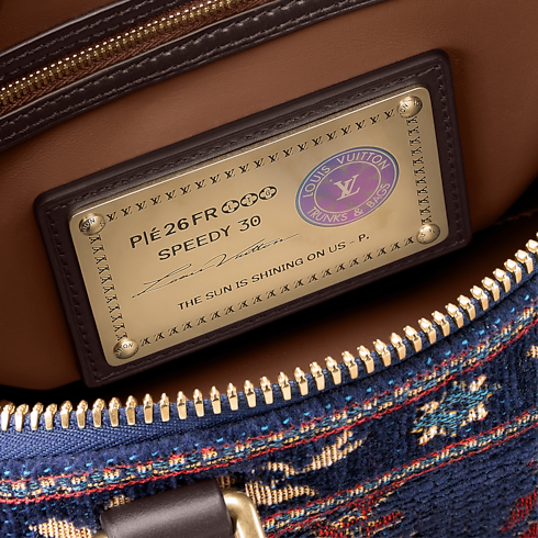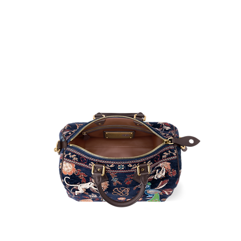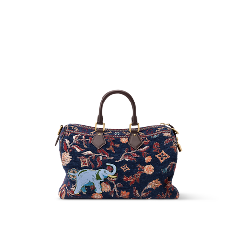 La borsa Speedy P9 Bandoulière 30 è realizzata in jacquard intessuto con filato di ciniglia in un ordito multicolore, creando un raffinato effetto arazzo. Gli animali ricamati in rilievo appaiono come in movimento sull'esclusivo accessorio. I dettagli in pelle color marrone cioccolato, quali le finiture, i manici superiori e il porte adresse, aggiungono un sofisticato contrasto al design vivace del modello.