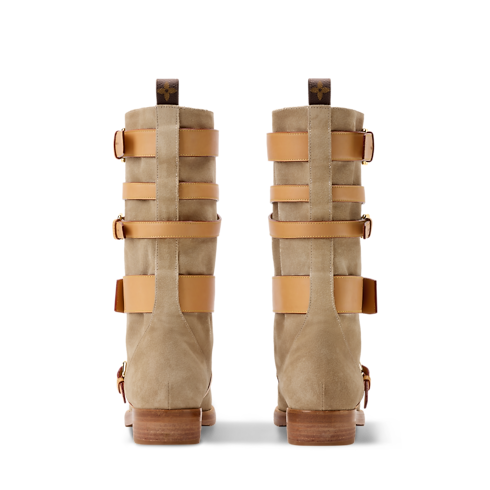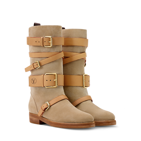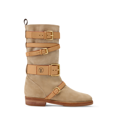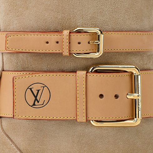 - Lo stivale basso Amiral è realizzato in morbida pelle di vitello scamosciata. Il versatile modello è impreziosito da cinturini di diverse larghezze nell’emblematica pelle naturale della Maison, ciascuno dotato della propria fibbia dorata. Un decoro con logo LV Circle stampato a caldo completa l'elegante creazione dallo stile bohémienne.