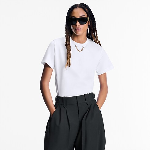 La T-shirt reinterpreta un grande classico del guardaroba casual con il tocco iconico di Louis Vuitton. Il modello è realizzato in morbido jersey di cotone traspirante, con un intramontabile taglio comodo ed essenziale, perfetto per tutti i giorni. Il dettaglio con catenella e logo LV Circle in ottone lungo il girocollo aggiunge una nota distintiva.