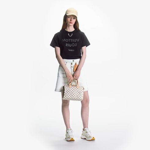 La t-shirt ripropone un taglio classico in chiave ironica e moderna. Il tessuto in jersey di cotone è impreziosito dalla firma Louis Vuitton al rovescio, stampata con un originale effetto screziato. La catenella aggiunge un tocco distintivo della Maison.
