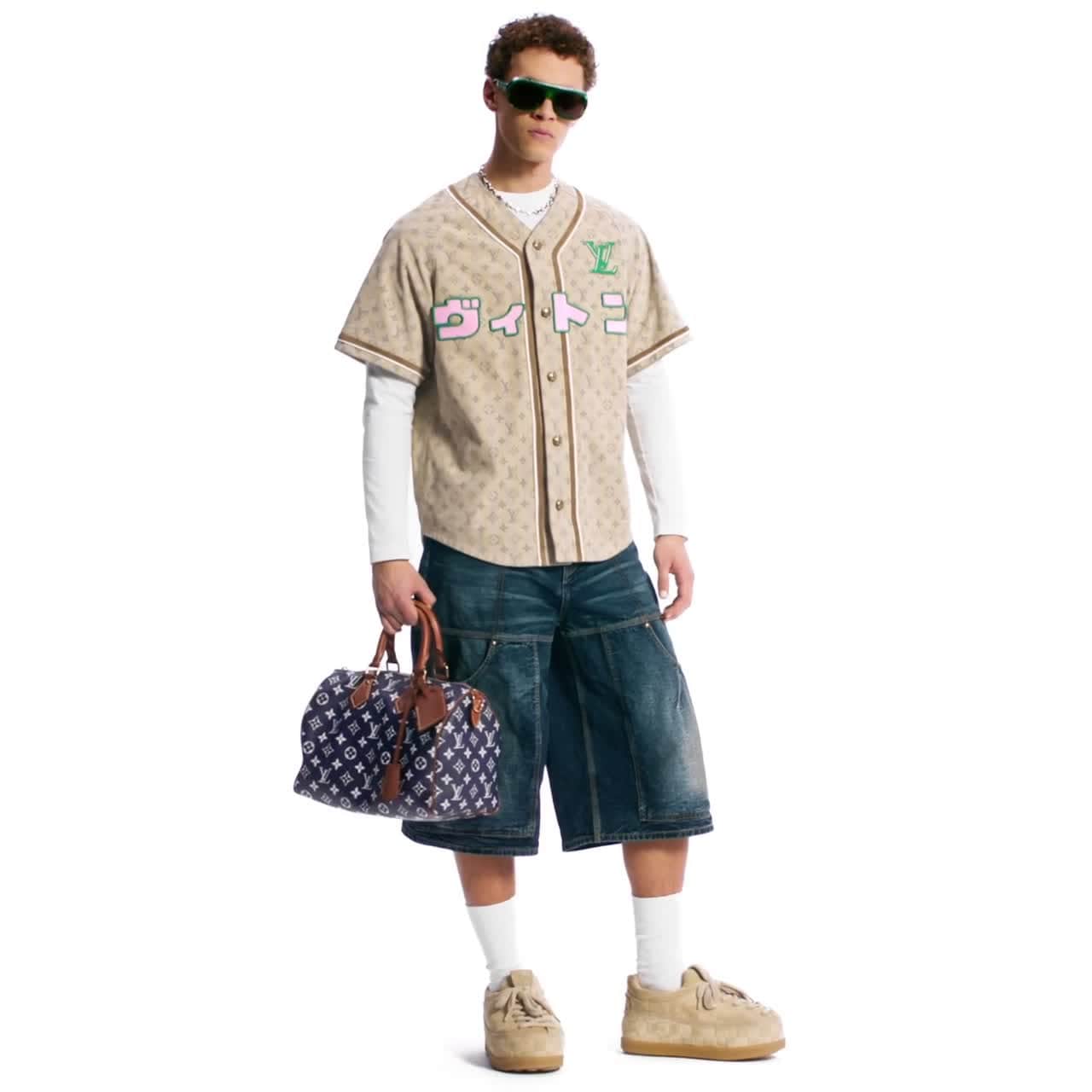 La T-shirt, frutto dell'estrosa collaborazione tra Pharrell Williams e Nigo per la Collezione Autunno-Inverno 2025, celebra il savoir-faire della Maison. L'esclusivo modello da baseball, in pelle di vitello beige, presenta un particolare effetto lino trompe-l'œil ed è decorato dall'iconico motivo Monogram all-over. La vivace applicazione LV Japan sul davanti e quella posteriore con l'emblematica firma in corsivo completano l'accattivante creazione.