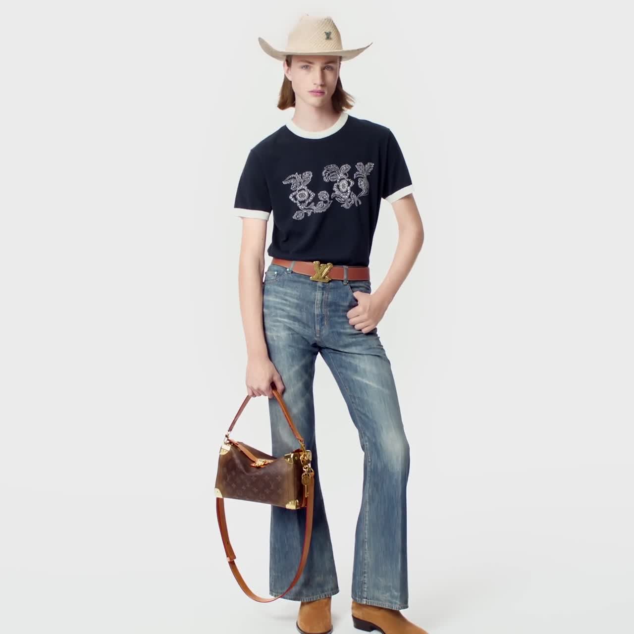 La T-shirt in cotone color blu navy si ispira all'estetica Western della sfilata Autunno-Inverno 2024. L'esclusiva creazione si distingue per il delicato motivo floreale delle iconiche iniziali LV, realizzato con lavorazione a intarsio. La firma "Marque L. Vuitton déposée" impreziosisce la parte posteriore, mentre i bordi a costine bianchi su colletto e fondo manica conferiscono maggiore definizione al capo casual-chic.