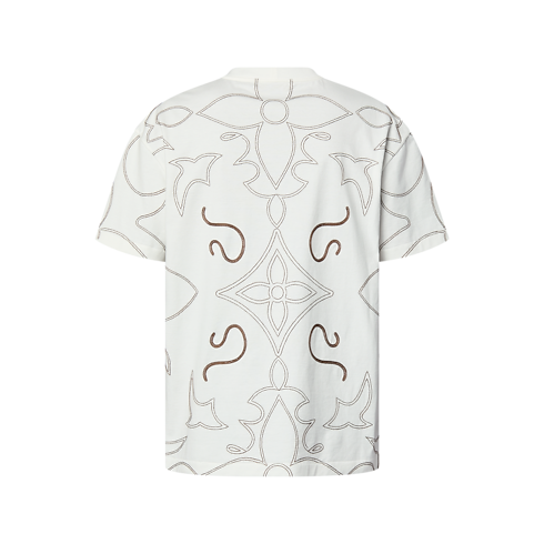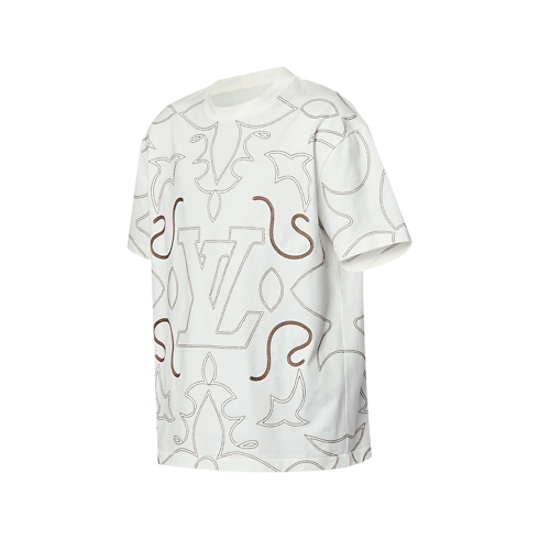 La T-shirt, in morbido jersey di cotone bianco, è impreziosita dal motivo LV Arabesque ricamato a contrasto all-over. L'elaborato decoro, presentato durante la sfilata Autunno-Inverno 2024, si ispira alle cuciture tradizionali degli stivali da cowboy. La creazione, ulteriormente arricchita dagli emblematici fiori Monogram e dalle iniziali della Maison sul petto, offre una perfetta sintesi tra stile romantico e contemporaneo.