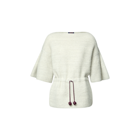 Ispirato alle influenze architettoniche presentate in passerella, il top in maglia è realizzato con un raffinato scollo a barchetta ed eleganti maniche a campana fino al gomito che delineano una silhouette scultorea, mentre una cintura in cordoncino di pelle con finiture LV Cubes valorizza il punto vita. Il modello è confezionato in un leggero misto di seta, alpaca e mohair, per offrire calore e comfort di livello superiore.