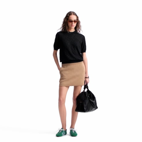 Il top in maglia fine di misto lana si distingue per lo stile chic ed essenziale al contempo. Il modello è impreziosito dall'iconico motivo Monogram Mahina della Capsule Collection Flight Mode, abilmente lavorato mediante perforature, e rifinito dai bordi a coste. Il design aderente, a contrasto con le maniche corte a sbuffo, crea un effetto sofisticato e femminile.
