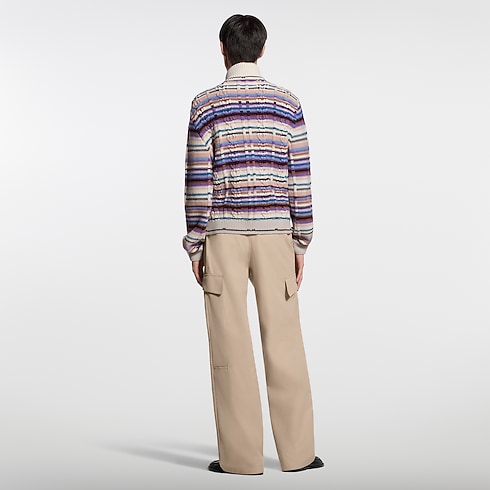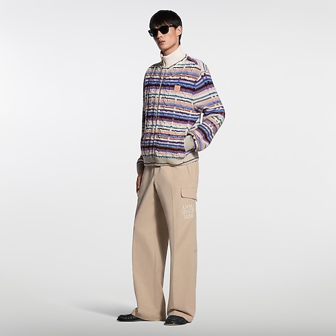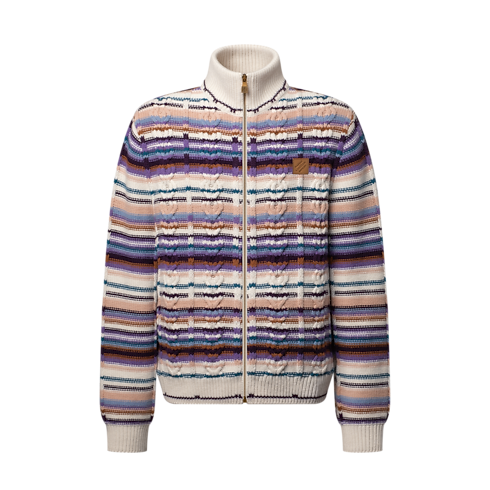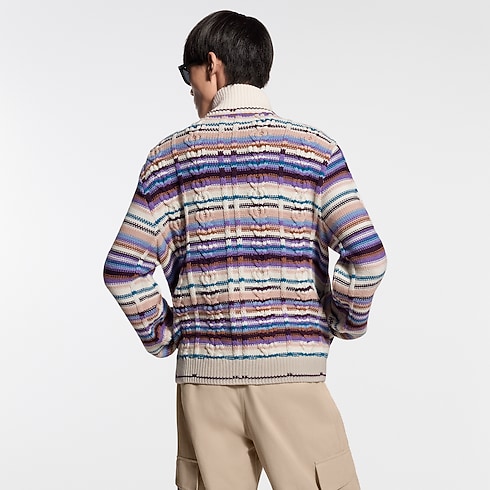 Questo raffinato top in tessuto misto lana e cachemire si distingue per il suo aspetto artigianale ed è impreziosito da vivaci righe inserite in una maglia a trecce dalla texture accattivante. Dotato di zip e colletto alto, può essere indossato sia come cardigan che come leggero strato esterno nelle miti giornate primaverili. Un'applicazione in pelle con firma sul petto completa il modello.
