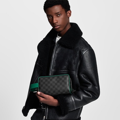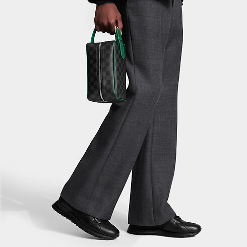 La trousse toilette Locker Dopp Kit, proposta in tela Damier Graphite, è caratterizzata dal comodo manico laterale in pelle color verde scuro. L'elegante dettaglio, impreziosito dalla fibbia argentata, può essere regolato per una maggiore praticità. Il compatto accessorio, abbastanza capiente da contenere gli oggetti essenziali, include una fodera lavabile e una tasca interna con zip.