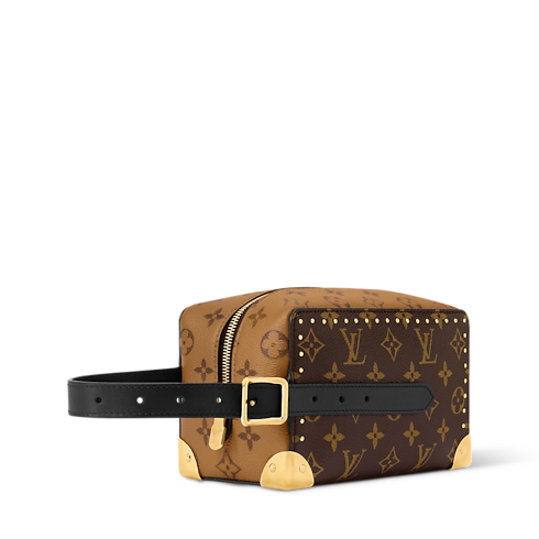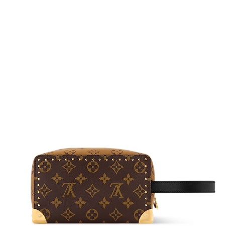 La trousse toilette Locker Dopp Kit Trunk, ideata dal direttore artistico della linea donna Nicolas Ghesquière, è realizzata in tela Monogram. Rivisitazione del modello originale con l'iconico cinturino laterale con fibbia, questa versione si distingue per gli angoli metallici rinforzati e le borchie dorate, raffinato richiamo ai tradizionali bauli della Maison. La creazione è completata all'interno dalla fodera in microfibra con motivo Monogram Reverse.