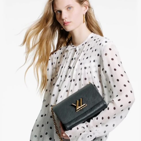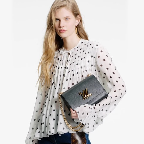 La borsa Twist MM, realizzata nell'emblematica pelle Epi della Maison, prende il nome dall'ormai celebre chiusura LV twist-lock, inconfondibile dettaglio in metallo dorato lucido. L'elegante modello, presentato in occasione della Sfilata Cruise 2015, si distingue per il design a "onda" della base. Il capiente accessorio, ideale per completare un outfit da giorno o da sera, è provvisto di una tracolla con catenella scorrevole che permette di portare l'accattivante creazione in modi diversi.